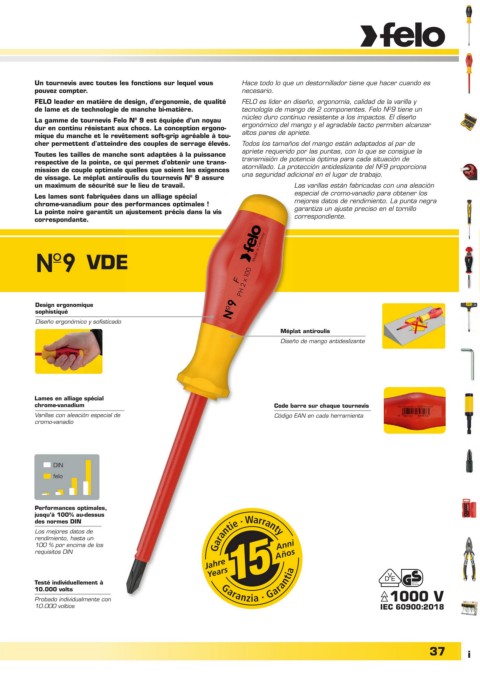 La gamme de tournevis Felo N 9 est équipée d’un noyau núcleo duro continuo resistente a los impactos. El diseño